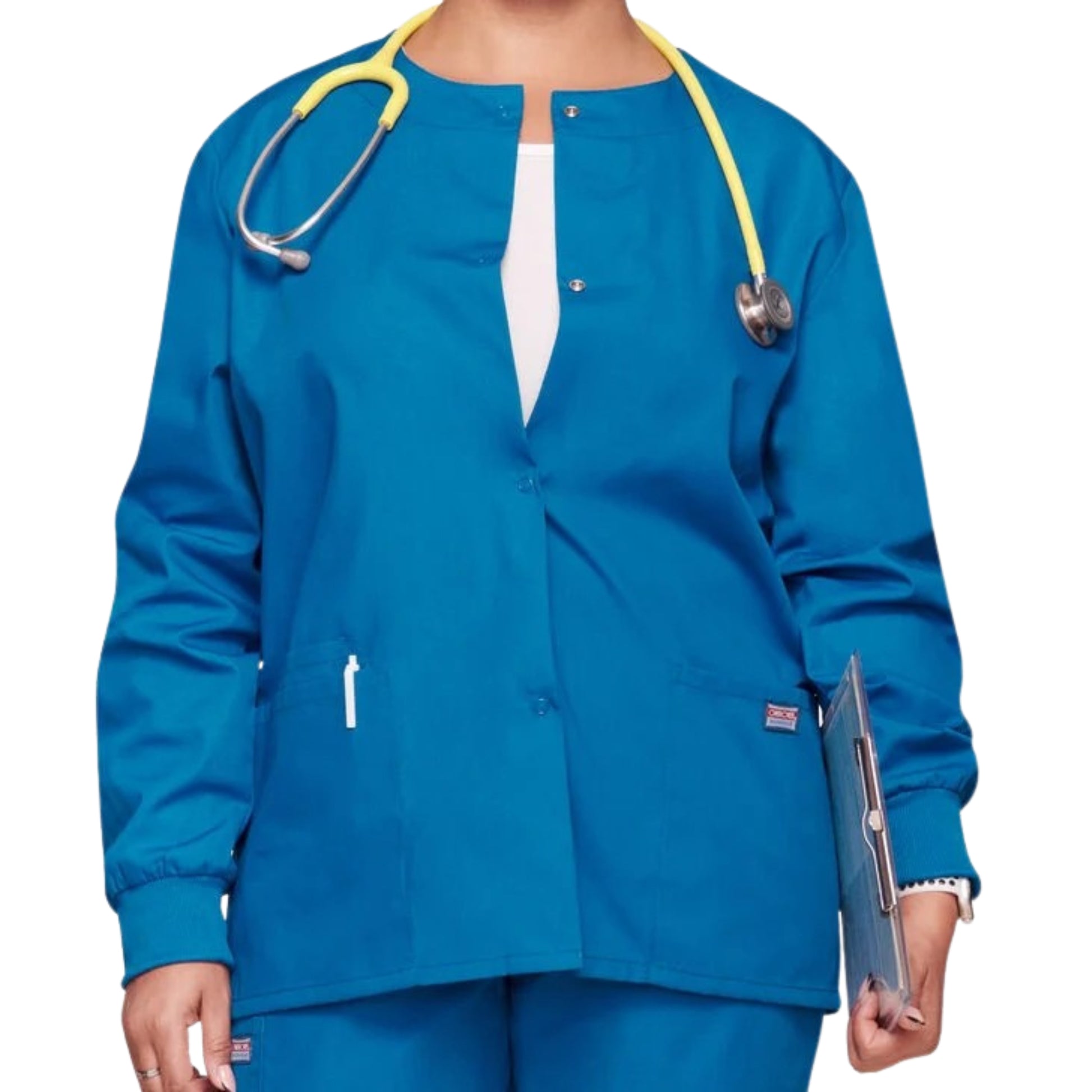 This jacket scrub top is designed for healthcare professionals who prioritize both comfort and functionality. This versatile piece serves as a lightweight outer layer or a standalone top, perfect for the demanding environment of a medical setting.